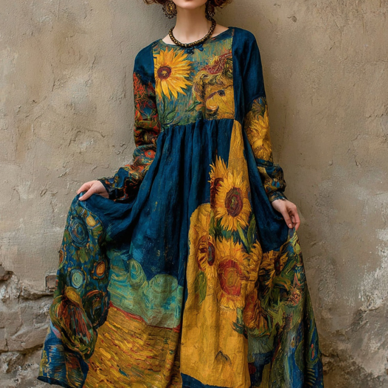 Women's Oil Painting Sunflower Art Print Round Neck Loose Maxi Dress