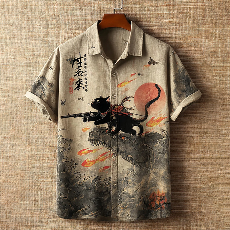 Men's Retro Black Cat Printed Short Sleeve Shirt