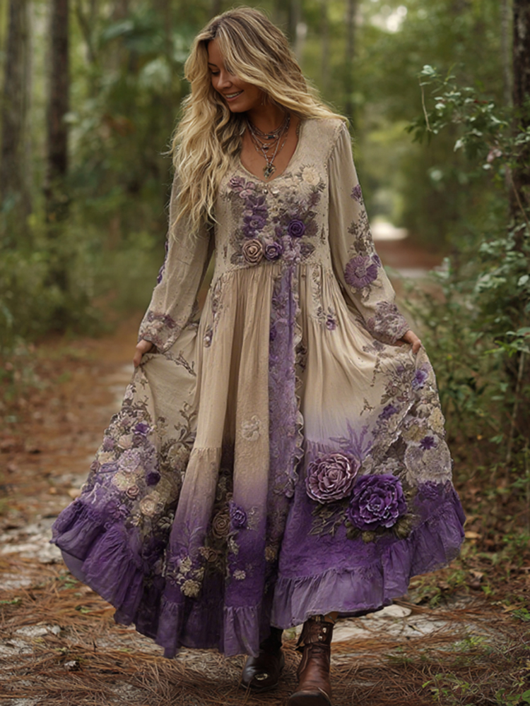 Vintage Classy Gradient Purple Lavender And Floral Embroidered Maxi Dress